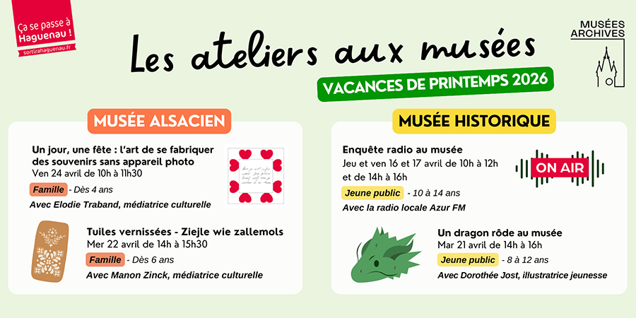 Places limitées. Tous les ateliers sont à 5 € par personne et sur inscription via le site de la Ville, rubrique « Mes services en ligne » ou au 03 88 90 29 39 ou par mail : musees-archives@agglo-haguenau.fr. Tous les participants doivent être inscrits.