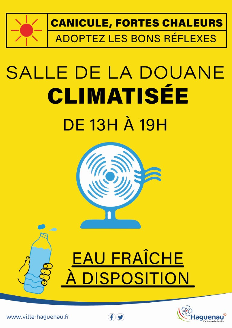 Enfin, en cas de déclenchement de l’alerte Orange canicule par la Préfecture, la salle de la Douane (accessible PMR) qui est climatisée, est ouverte au public tous les jours de 13h à 19h (durant l’alerte) et de l’eau fraîche est à disposition des usagers.